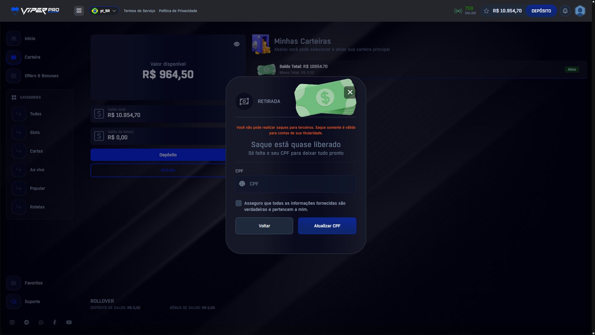 Example: require a user to deposit R$1,000.00 to reward them with R$10.00. Missions are fully configurable.